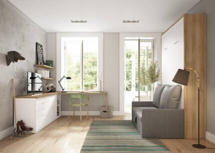 Bedroom-study with horizontal folding bed with sofa and wardrobe.