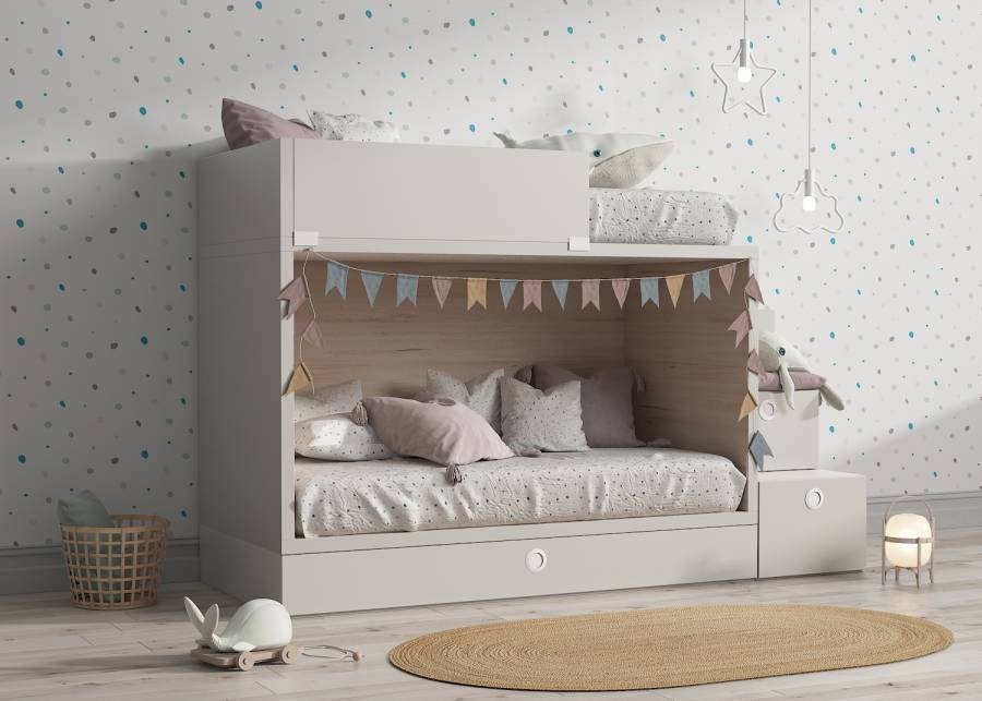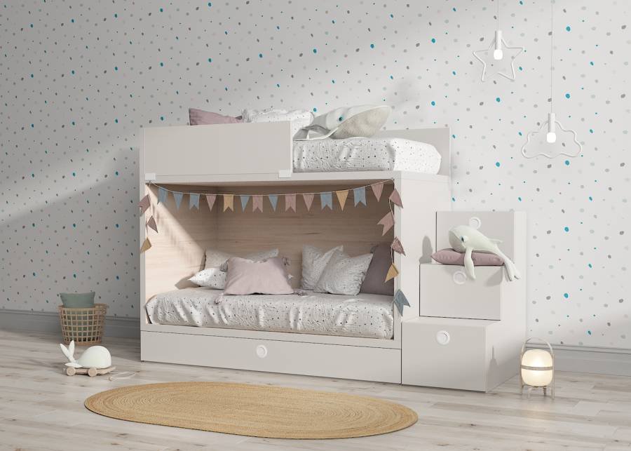 Make sure no one is left out of your little one’s sleepover with this 3-bed children’s and youth bunk bed . Optimize the space in the bedroom thanks to this bunk bed with a pull-out trundle bed below  and   storage stairs, 2 door-type and 1 drawer.