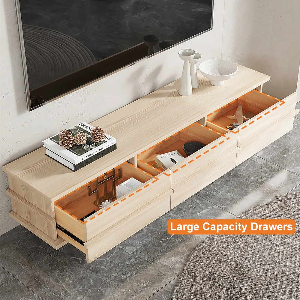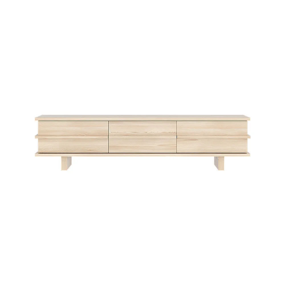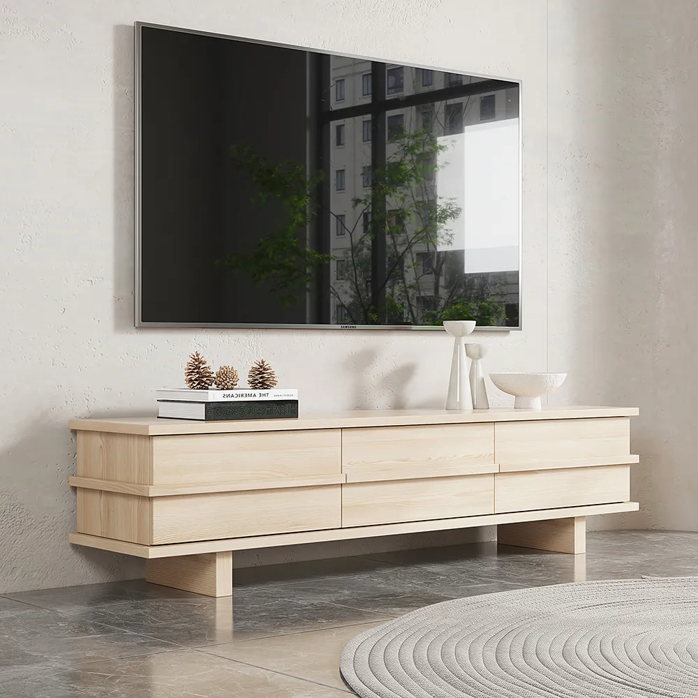 This natural wood TV unit boasts a sleek and modern design, complete with ample storage space in its convenient drawers of panels for visual flair.