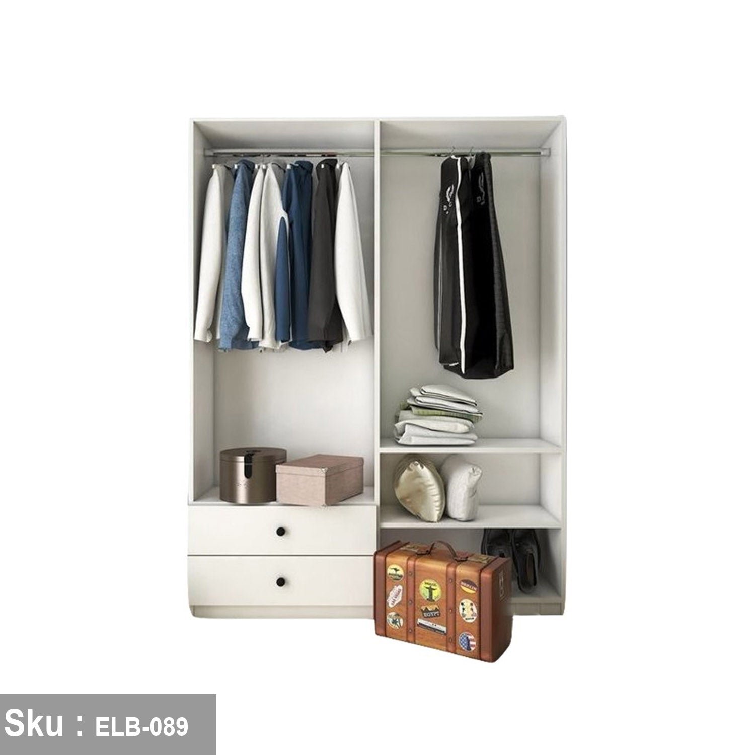 Made of high-quality MDF wood, it consists of shelves, two drawers, and two hangers.