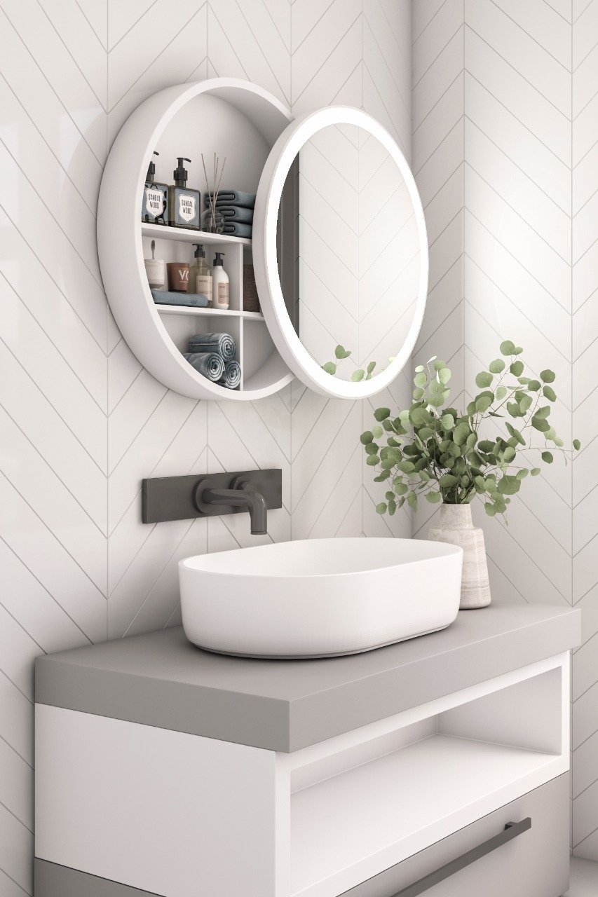Take perfect Selfies with this elegant and modern bathroom mirror, its round shape adds a charming and stylish touch to your decor, in addition to the storage unit that is useful in keeping all your beauty products in one place.