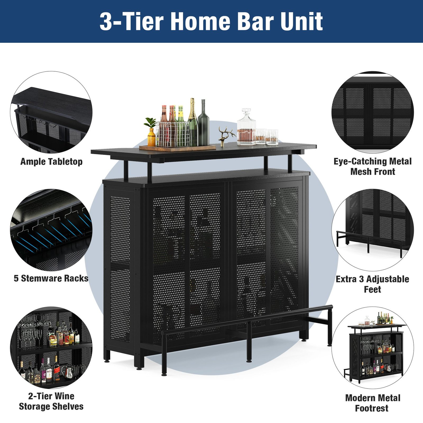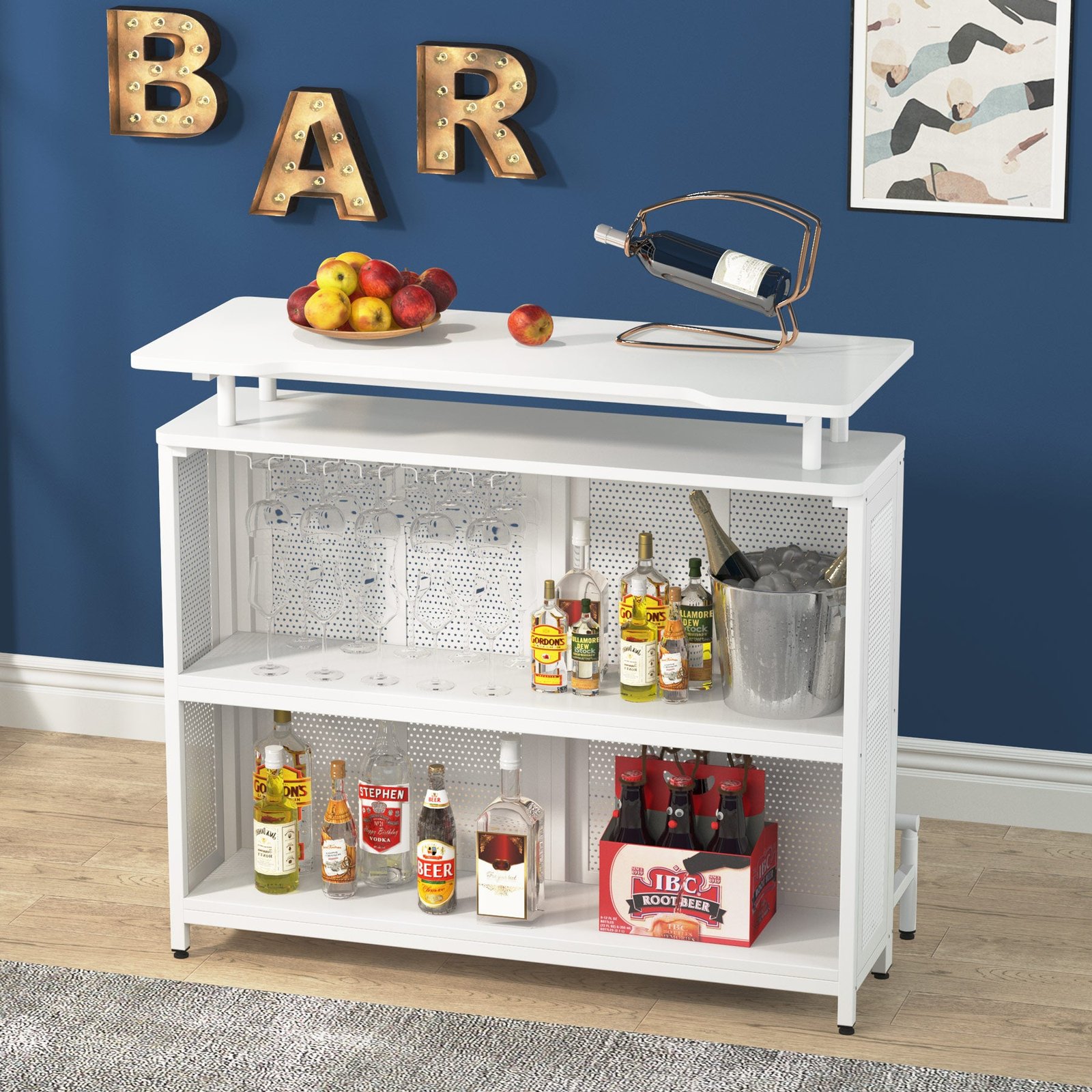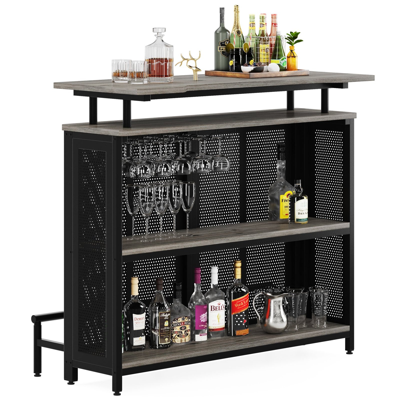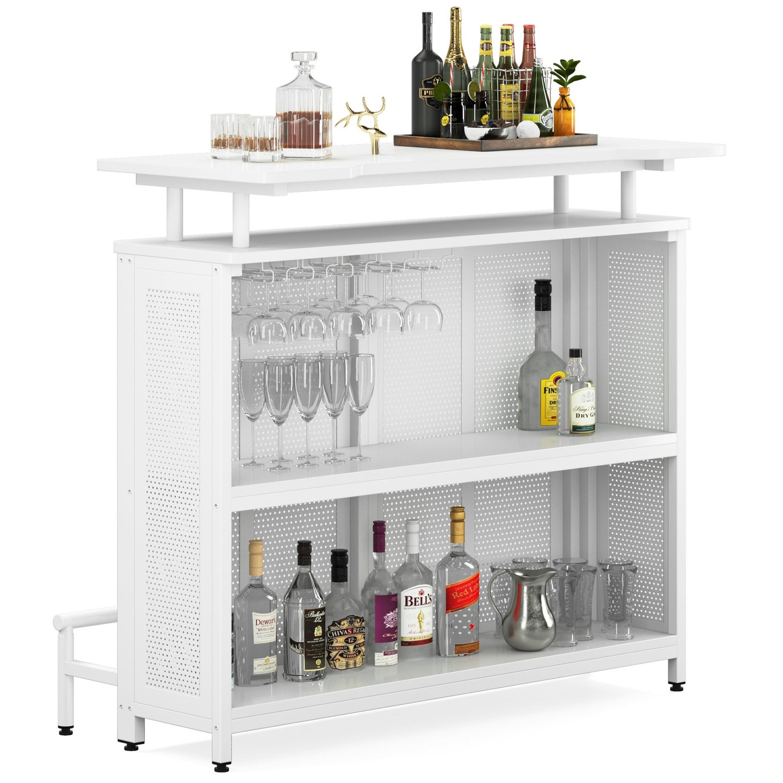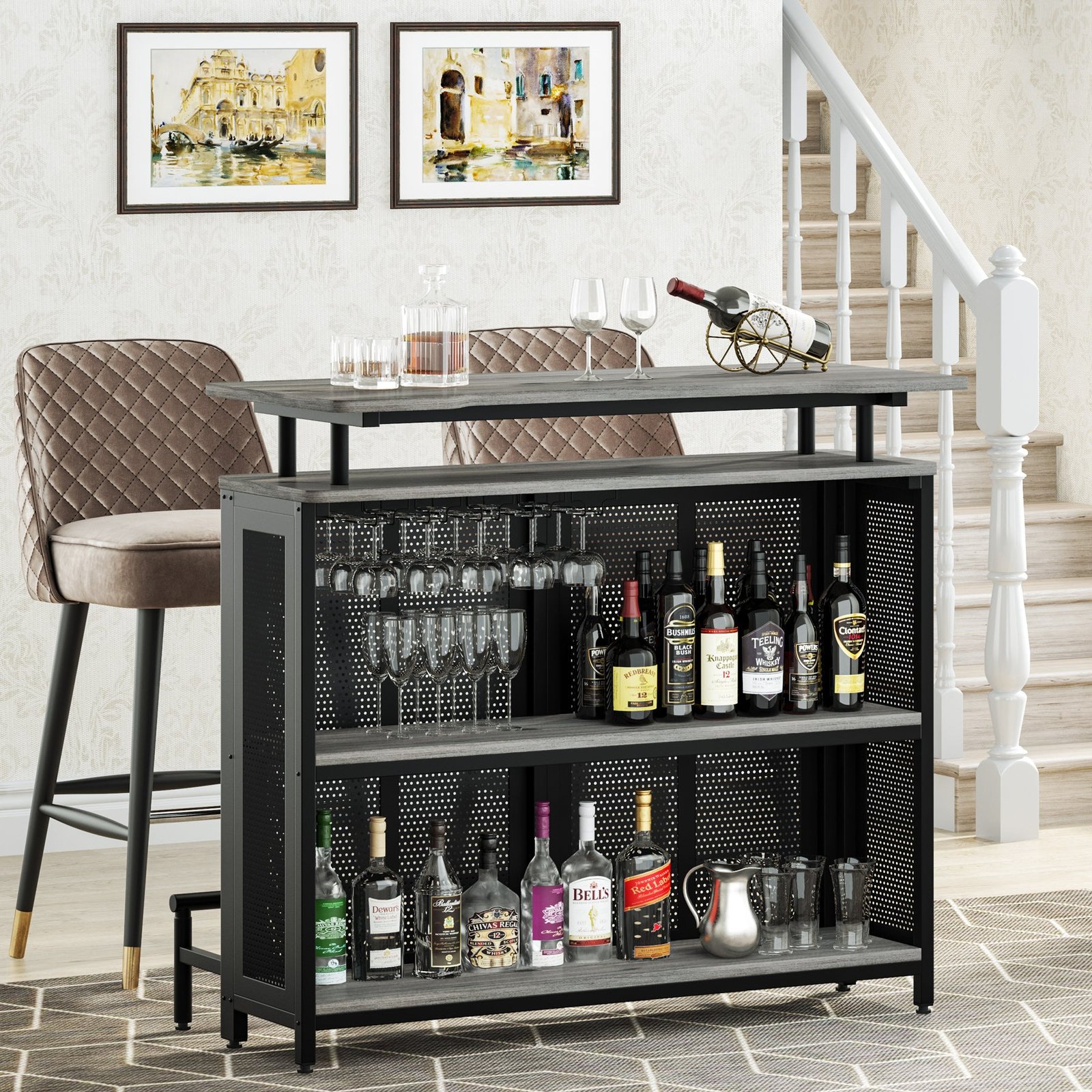 SPACE FOR ALL YOUR WINE ? Enjoying your favorite drinks on the generous sleek top of the bar unit, and 2 interior shelves keep spirits, mixers, and more where the barkeep can see them, while 5 built-in stemware racks hold up to 15 wine glasses, champagne flutes, or snifters.