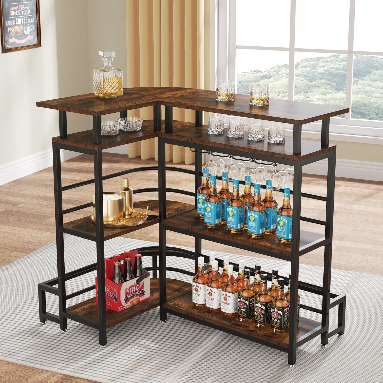 L-Shaped Design ? This home bar unit design with L-shaped, macroscopic simple appearance, combine with eco-friendly E1 MDF board and solid metal, a mix of rustic brown and black color, not only very sturdy but more industrial plus a little vintage, extraordinarily special and stylish.