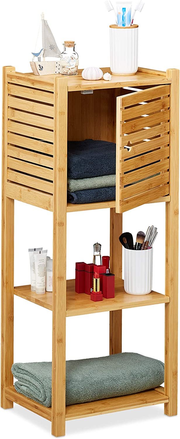 - With door: standing shelf has 1 compartment with door – for hygiene items, toilet paper and much more. In the bathroom