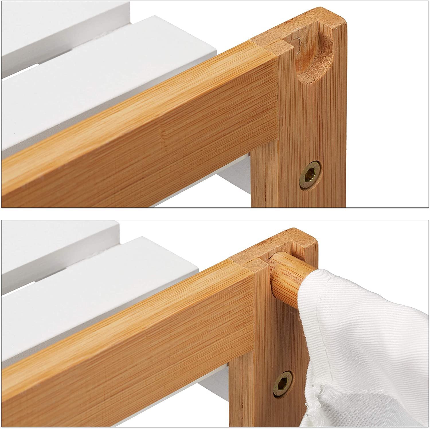 • 2 in 1: Practical bamboo shelf with integrated laundry basket in white – perfect combination for your bathroom