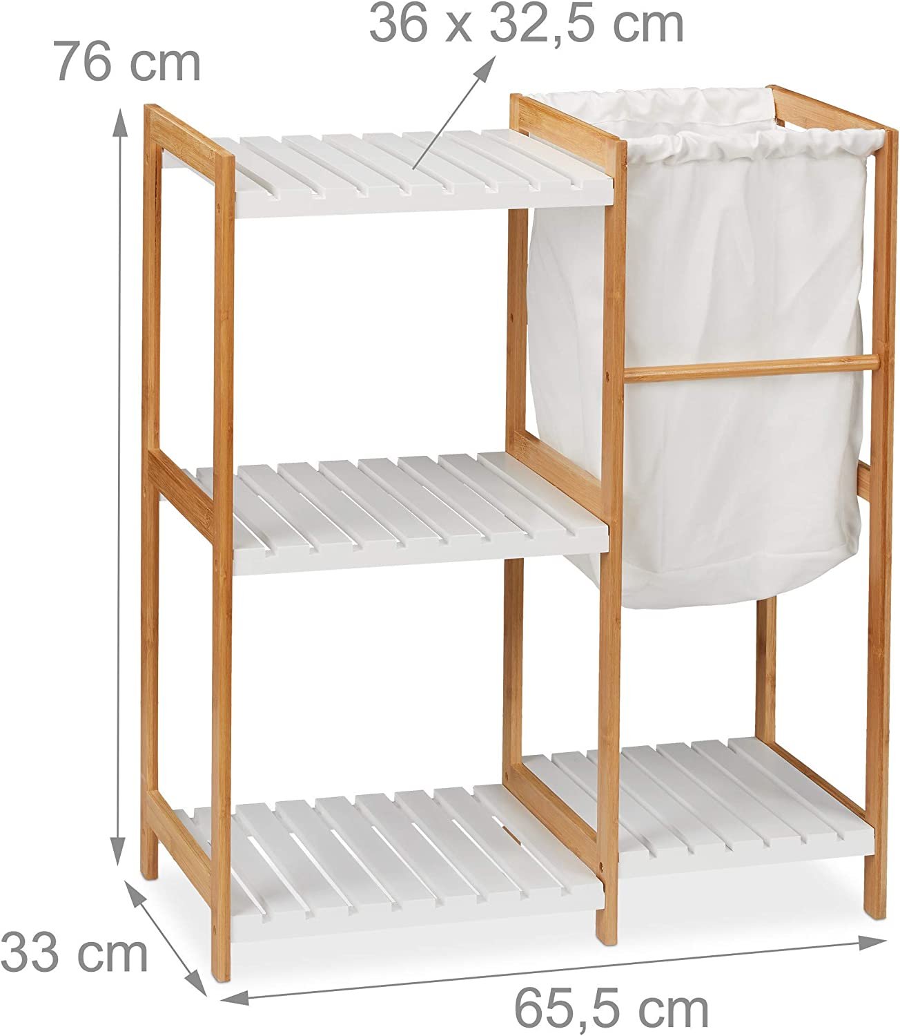 • Basics: bathroom shelf made of bamboo and MDF ? HBT approx. 76 x 65.5 x 33 cm – Fabric laundry basket volume: approx. 34 litres
