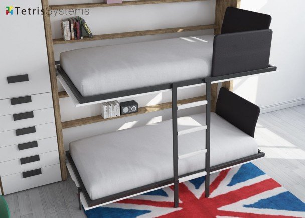 Youth room with high-quality folding horizontal bunk bed, large corner wardrobe and table with metal supports.