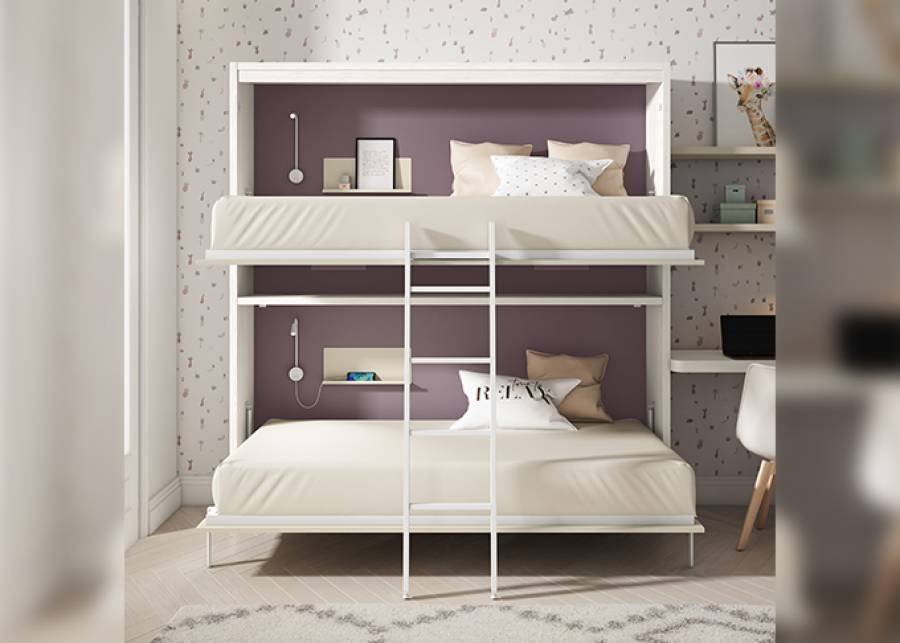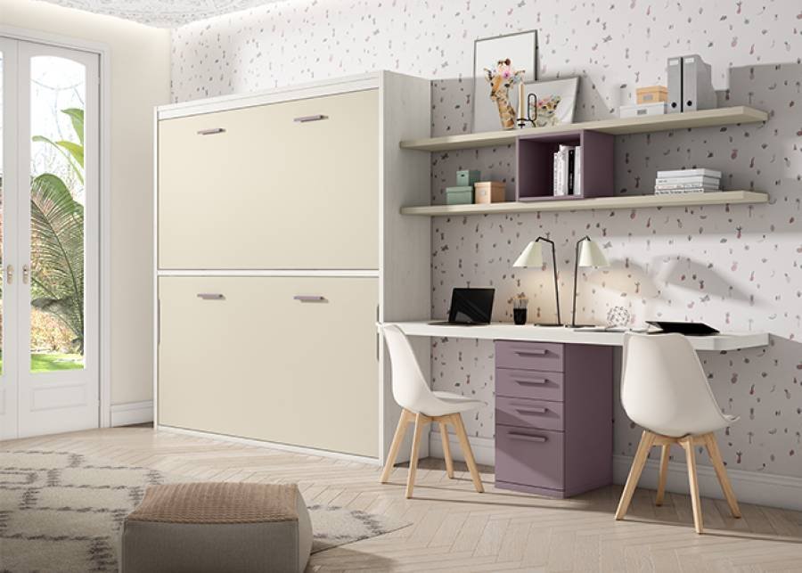 A youth bedroom that doesn’t waste a single centimetre thanks to furniture that optimises space and also provides well-being . As in the case of this room, with a horizontal folding bunk bed that allows you to have enough space to play, study during the day and rest comfortably at night. This custom-made composition also has a study area with a desk for two supported by a module of pull-out drawers , completed with an open shelf that provides extra storage to the room.