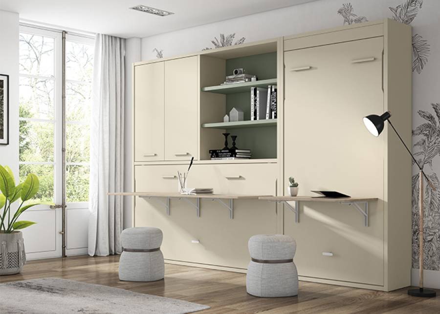 A doubly practical environment : it accommodates two children and, at the same time, makes the most of the space . All this thanks to the separate folding beds that star in this composition. The two folding beds, both horizontal and vertical , have integrated folding desks that create a large study area during the day. The set also has a wardrobe with folding doors and a 3-space shelving unit .