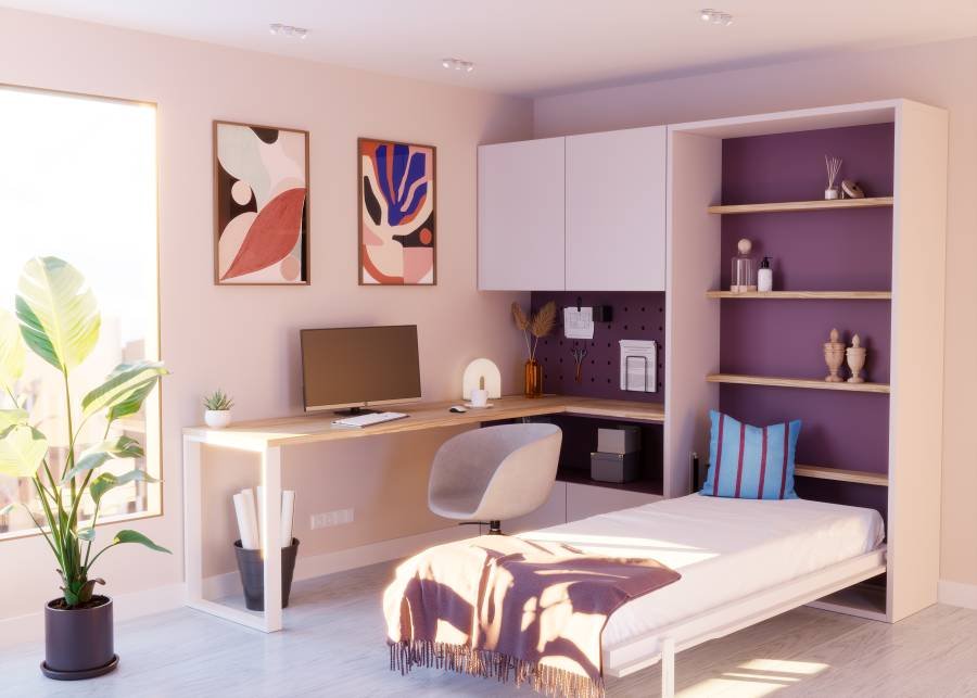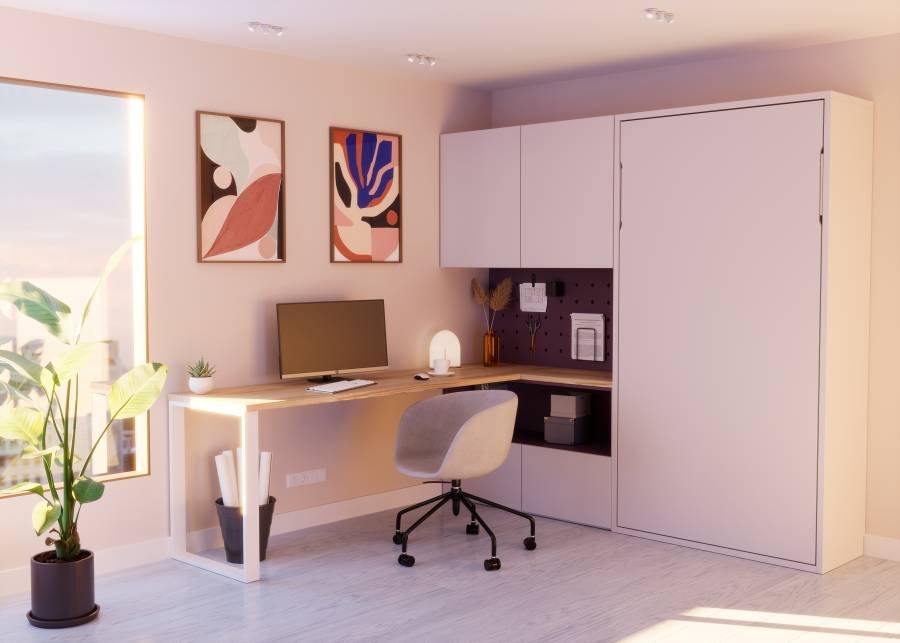 This bedroom with a vertical wall bed and study area redefines efficiency in the home. Designed for small spaces, this multifunctional solution allows you to enjoy a cozy study during the day and transform it into a quiet bedroom at night