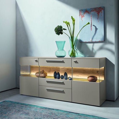 The sliding door with a glass panel allows you to see what?s inside the cabinet without opening it. The drawers have a simple design with horizontal pulls in a chrome finish.