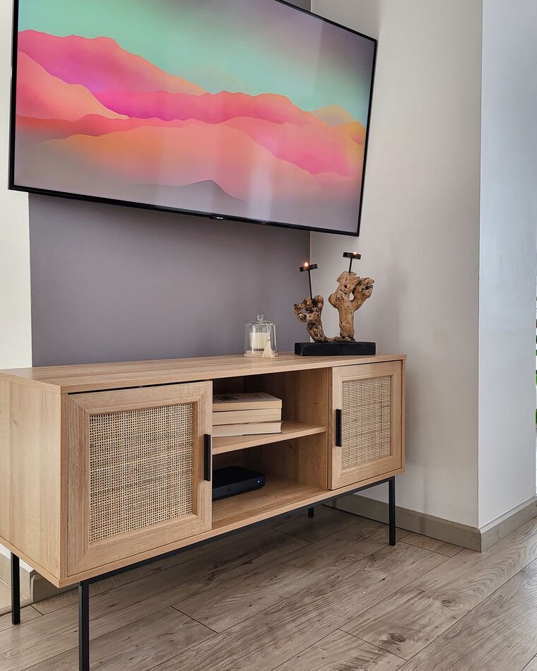 TV stands have evolved beyond simplicity and monotony. This distinctive cabinet, featuring natural rattan doors, adds a generous dash of boho flair to your living space. the black metal legs not only offer a striking color contrast but also ensure durability and longevity.
