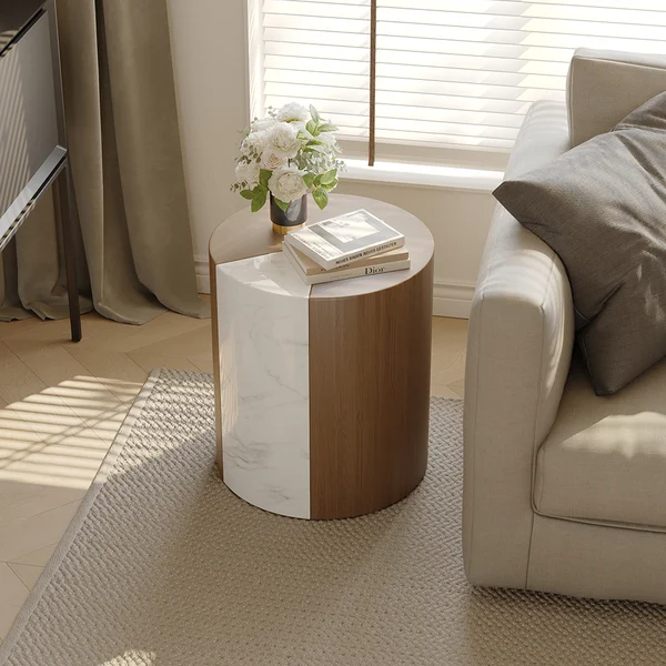 It features a wooden color with a marble finishing touch.