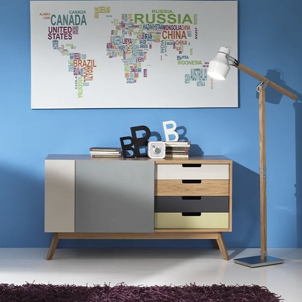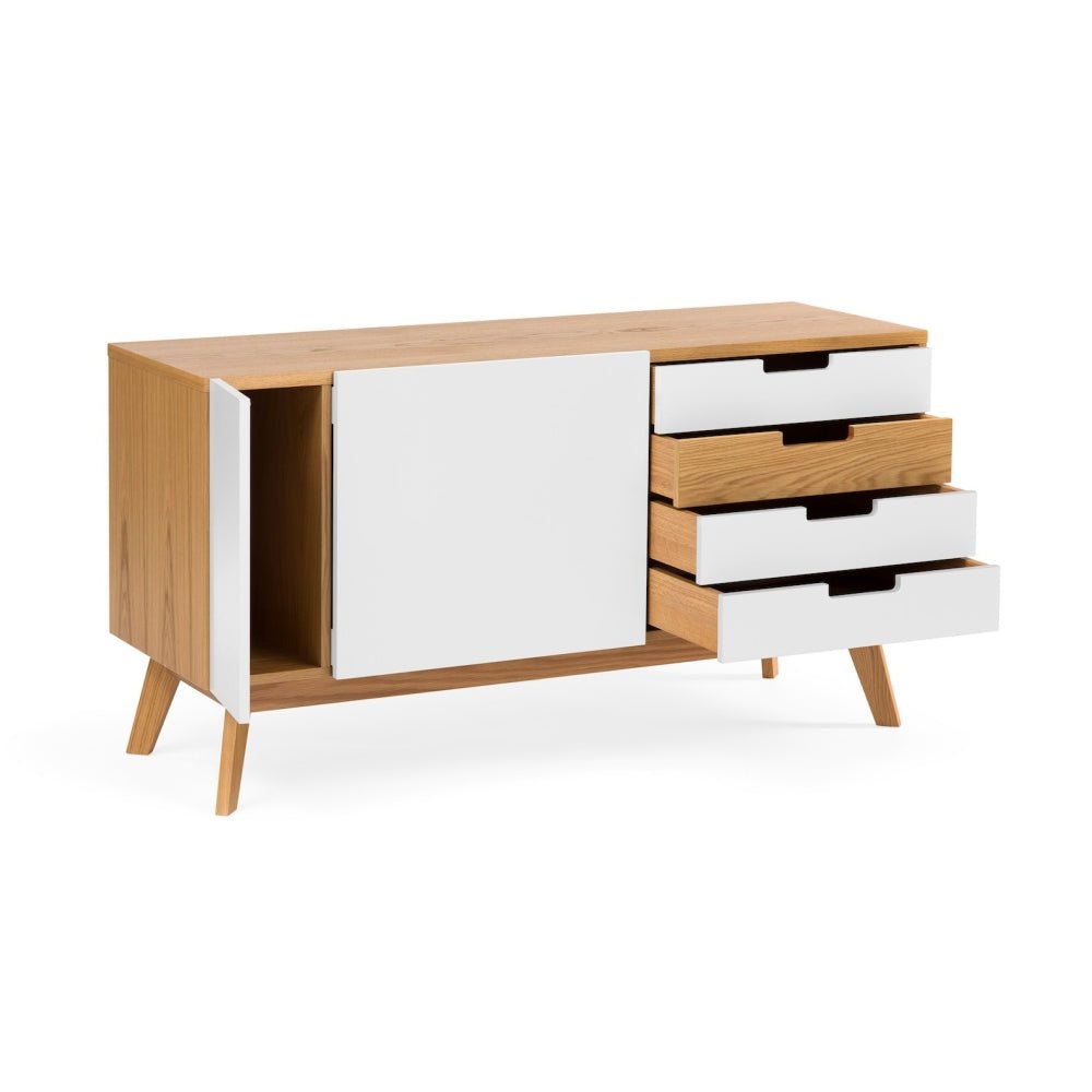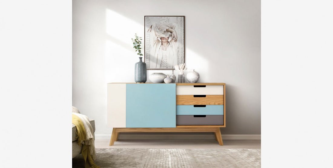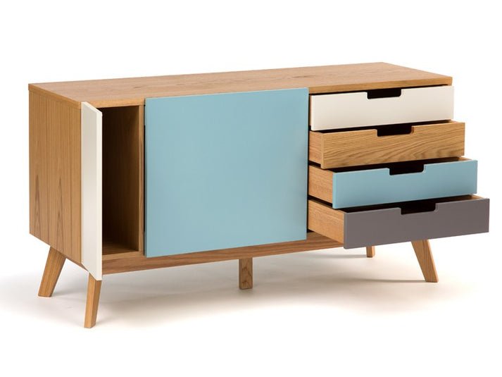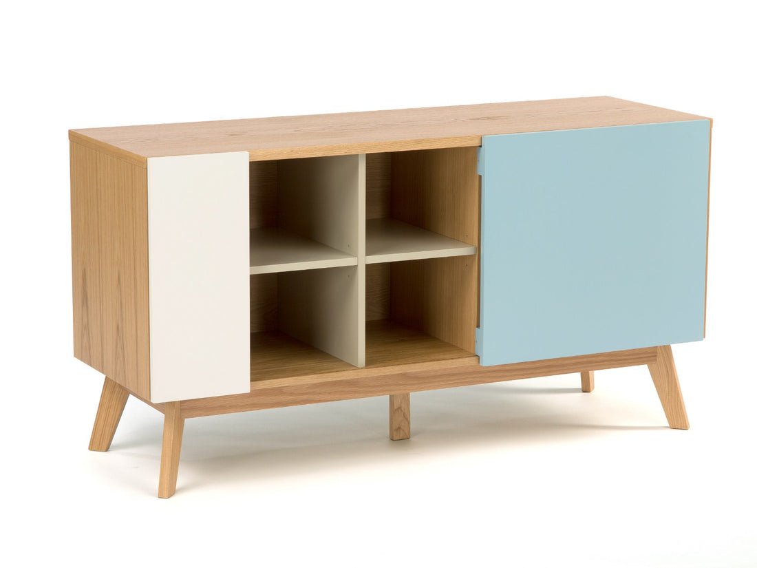The sideboard table is a mid-century modern sideboard with a combination of wood and painted surfaces. Here?s a breakdown of its features:
