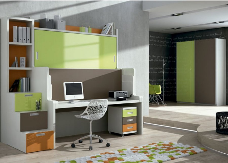 Children’s bedroom with folding bed-table-bunk bed for 90×190 mattresses (in both cases).