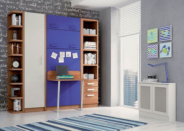 Children’s room equipped with a vertical folding bed for a 90 x 190 mattress. This bed offers the possibility of combining the upper flap in a prominent colour and adding a folding table at the front.
