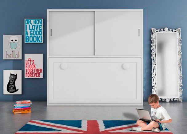 Children’s bedroom with horizontal folding bed and wardrobe with 2 sliding doors