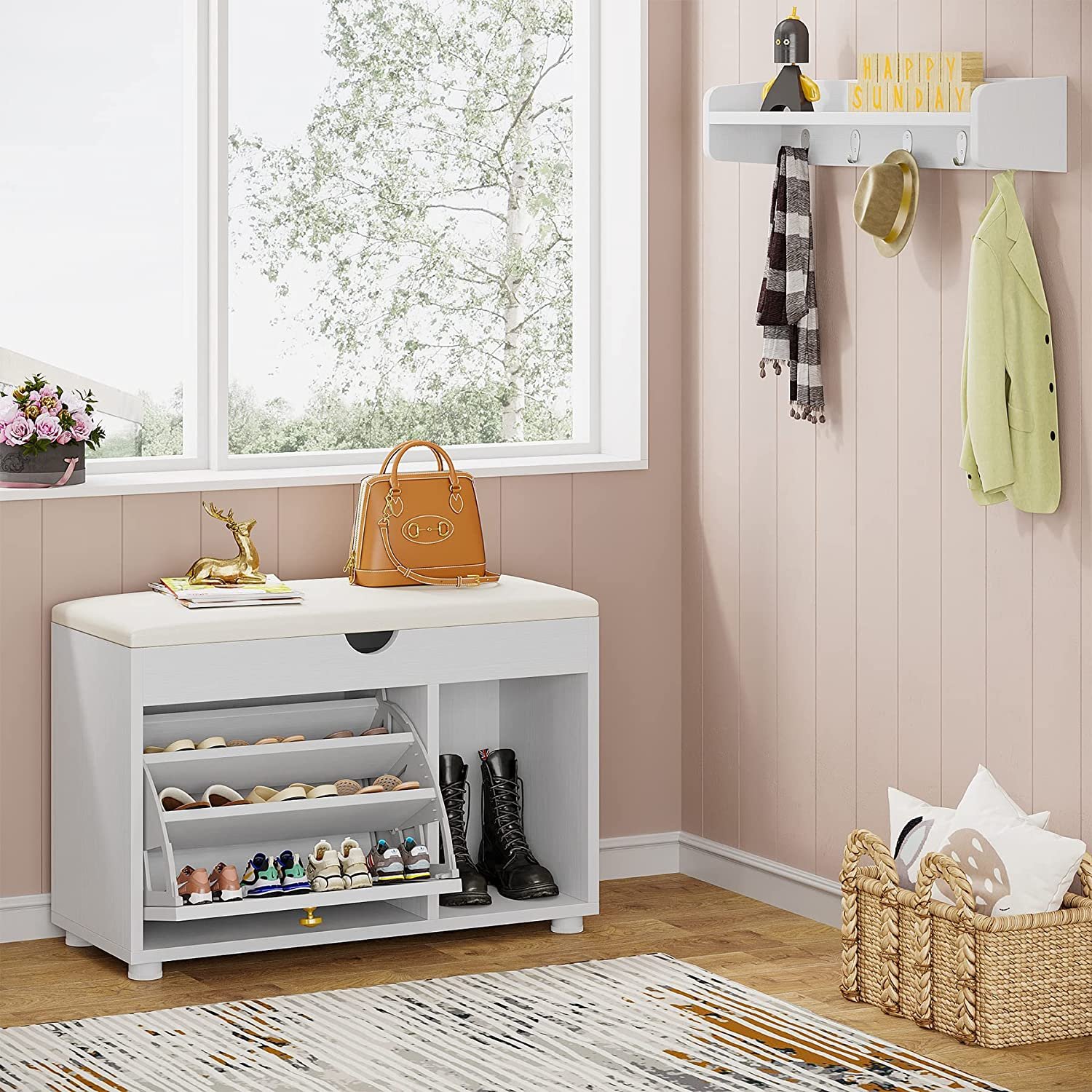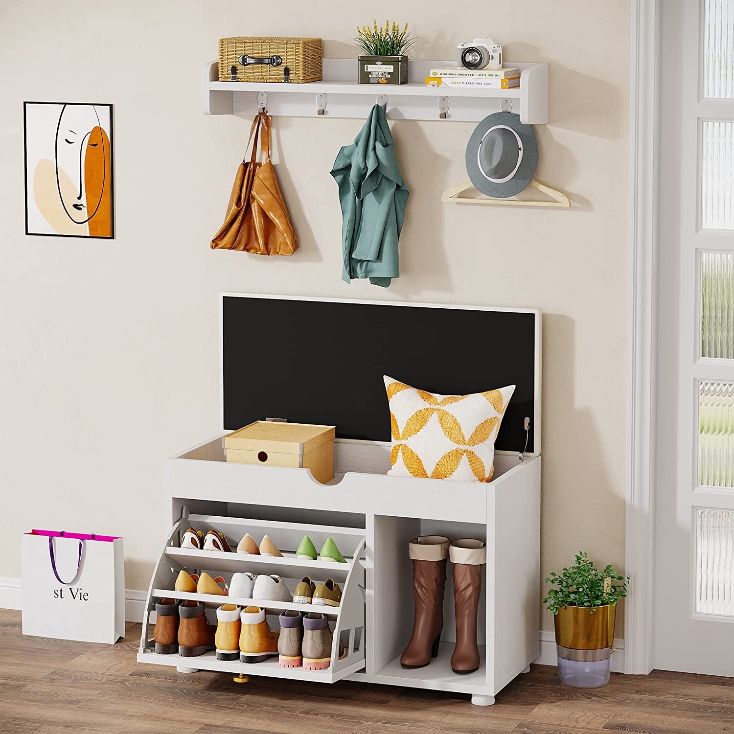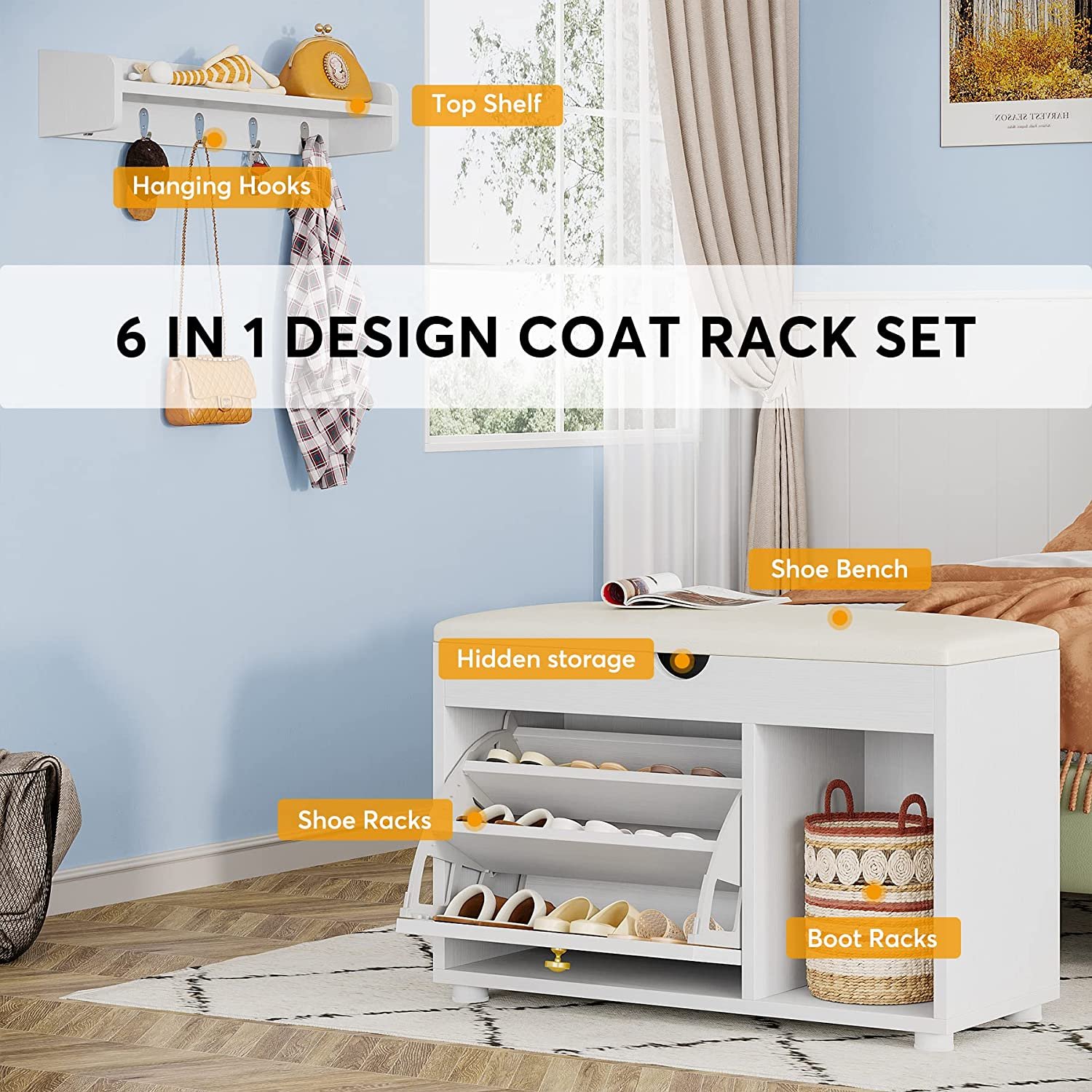 6 IN 1 MULTIFUNCTIONAL USAGE ? Comes with hanging coat rack, top decoration shelf, shoe bench, hidden storage under bench, 3-tier flip-drawer shoe cabinet and boot rack. This coat rack shoe bench hall tree helps organize a whole family?s overcoats and necessaries, creating an orderly, delicate look for home. You can also sit on this shoe bench and take off your shoes easily.