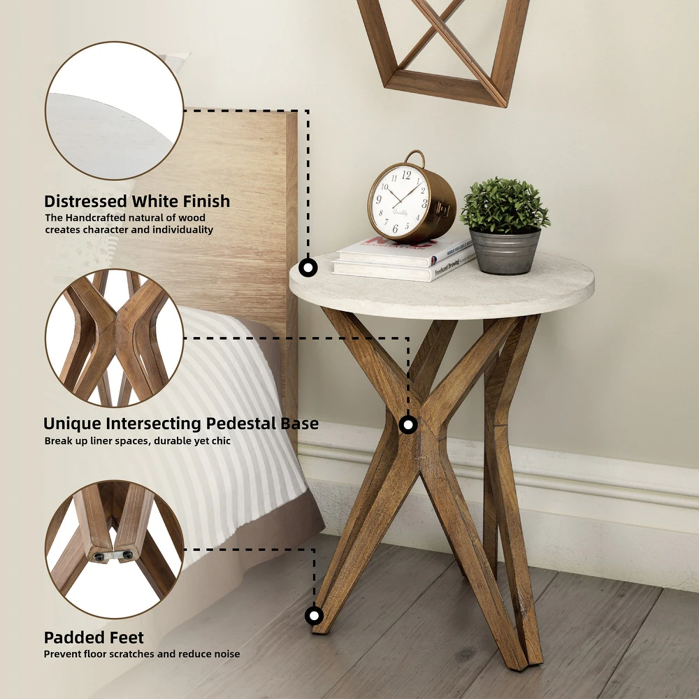 Add a touch of elegance and sophistication to your home with this side table. The distressed white top gracefully blends with natural wood grains and aging for a charming look. Whether you prefer boho style, this versatile accent table is perfect for any room in your home.