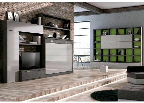Wall composition for dining room with a folding bed measuring 30 cm deep x 238.5 cm high, a bookcase on the upper part, which includes a low horizontal folding double bed