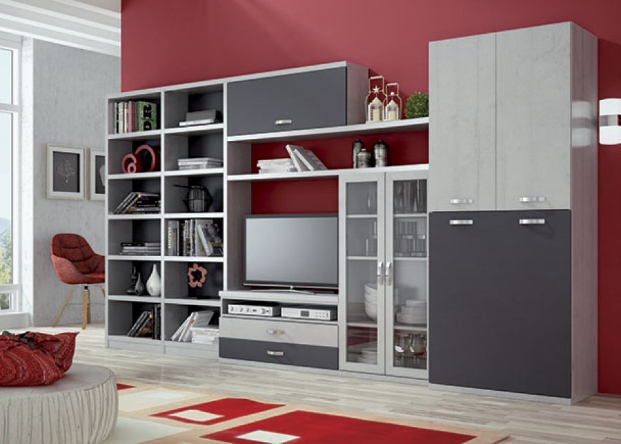 This room corresponds to a living room equipped with a wall composition, in which one of the pieces of furniture hides a folding bed for a 90 x 190 mattress. This piece of furniture also has a wardrobe with swing doors on the upper part.