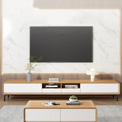 - Ample storage: with an open area and two sliding doors for organized multimedia equipment .
