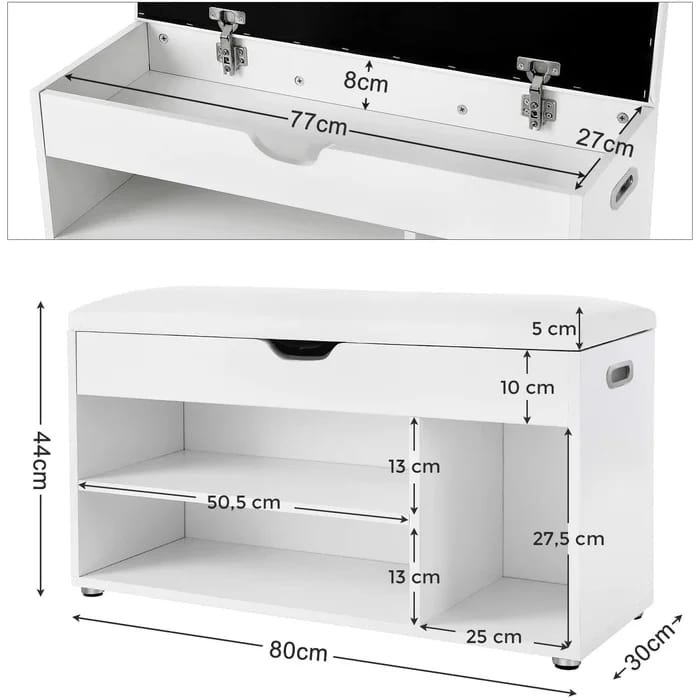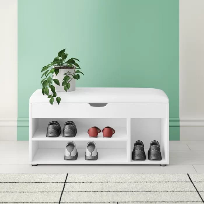 This entryway shoe storage bench helps you to keep your home organized without any clutter. Its white color fits any modern decor. The bench padded seat material is of high-quality that and is easy to clean.
