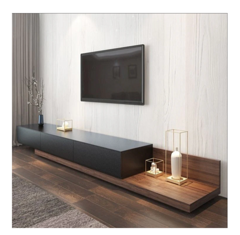 The TV unit is a modern media console with a combination of open and closed storage: