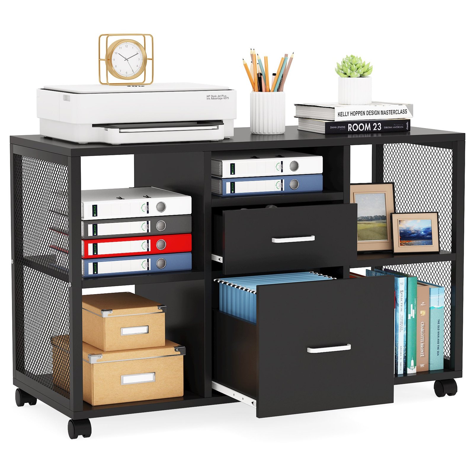 2 Drawers & Spacious Work Surface? This two-drawer file cabinet has a black wooden finish. Come with a shallow top drawer for accessories or personal items, with one additional larger drawer below intended to fit letter-size file folders and papers. It hides away papers and documents while capable of displaying a beautiful vase, photo albums, sculpture, printers, or other items on its top surface.