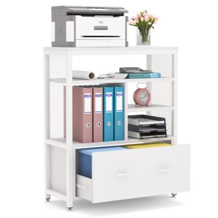Large Storage Space Filing cabinet ? Featured with 2 large drawers and an open storage shelf and a spacious table top, this under-desk file cabinet is perfect to keep the office machines, paper, files, and suppliers organized, make your room well organized. Hide this white wood file cabinet underneath the table to save space or Place it at end of your computer desk to extend the workspace.
