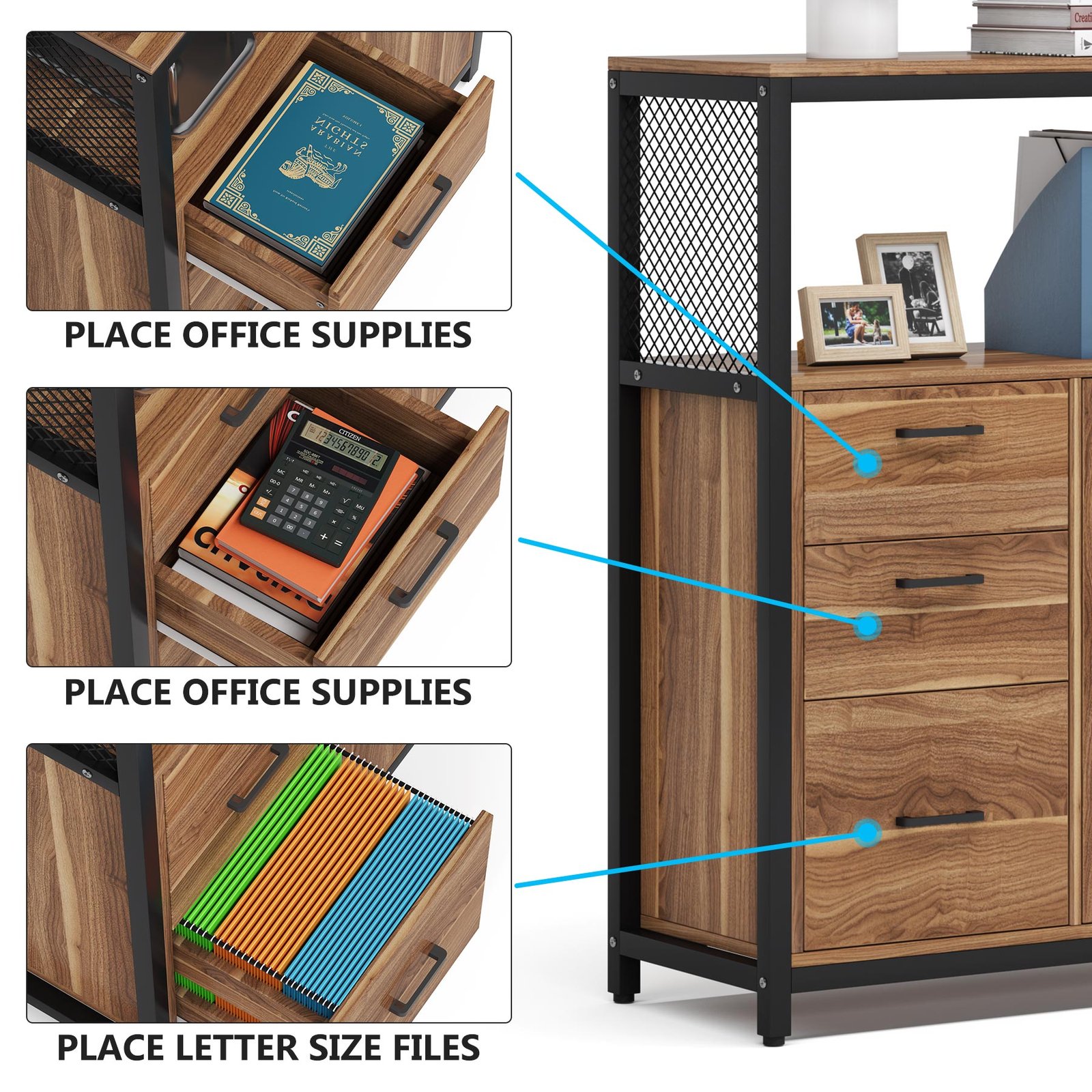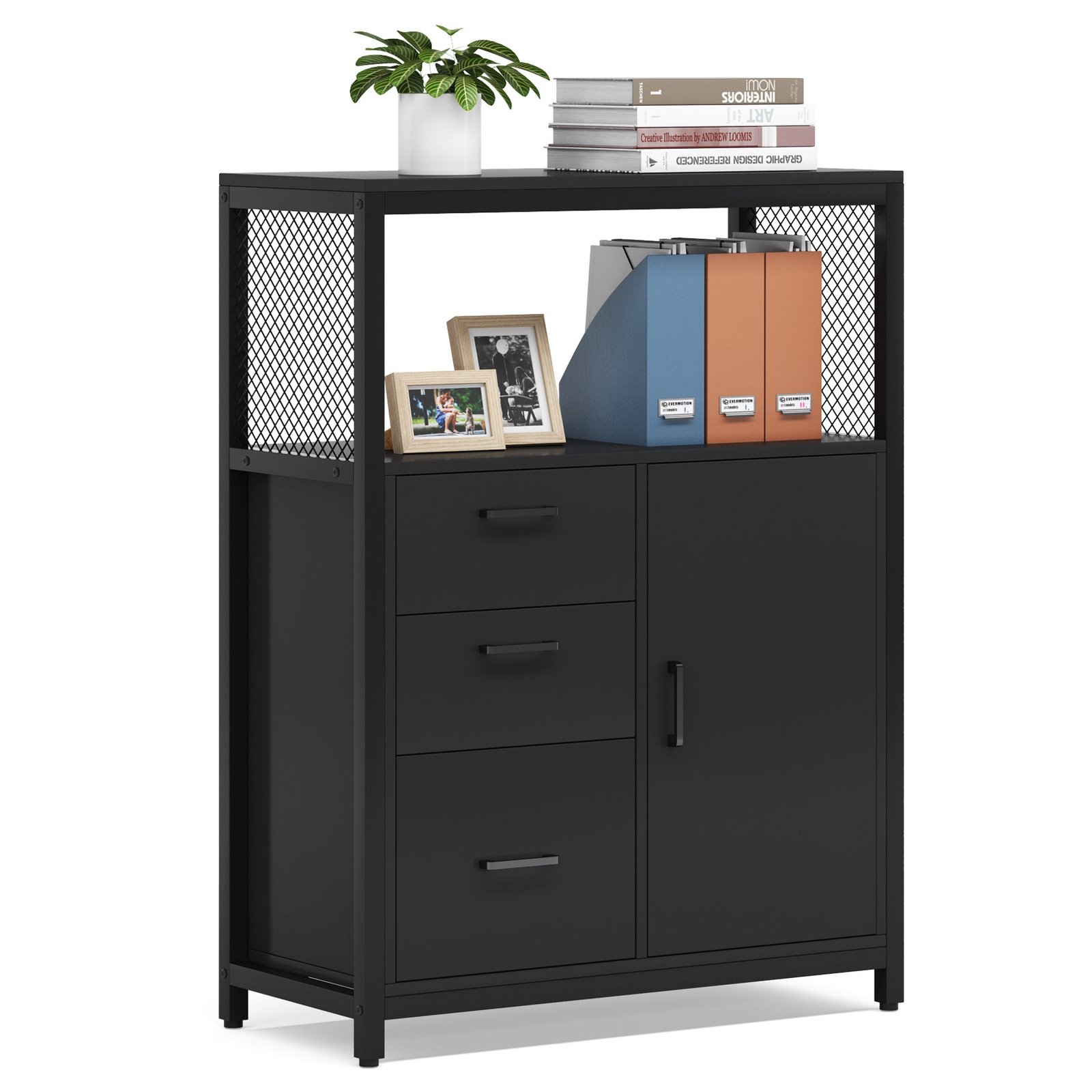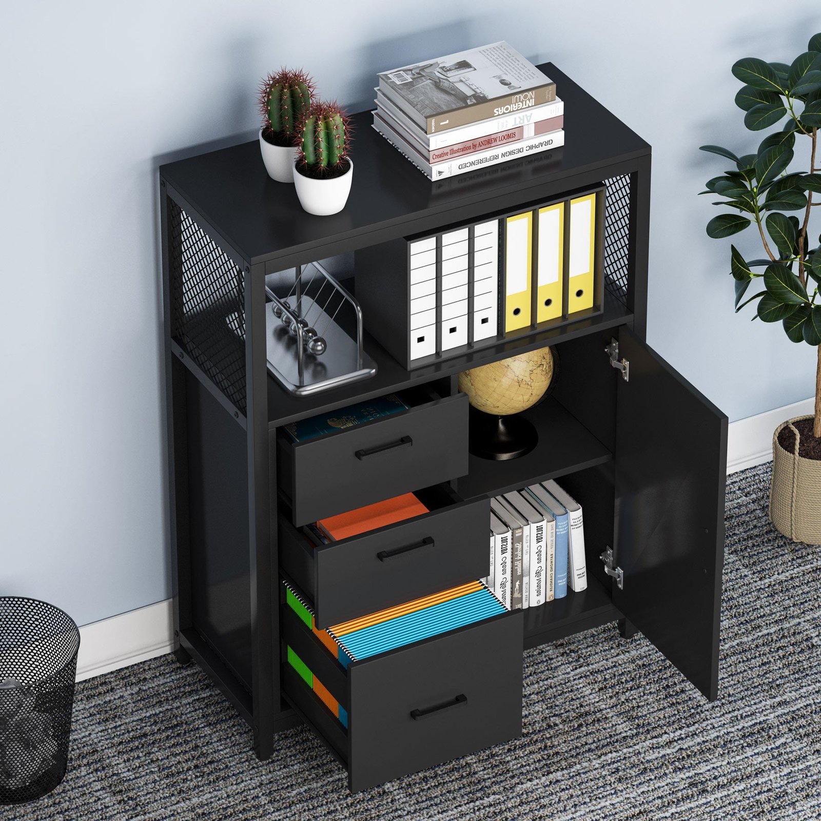 Multipurpose Cabinet ? Designed to meet a wide variety of needs in the home office, features drawers and doors as well as an upper storage shelf to keep your books papers, files and suppliers organized. Black steel along with the woodgrain finish make this unit stylish to complement any home office. Also can be placed in the Bedroom, Hallway, and Entryway as a storage cabinet.