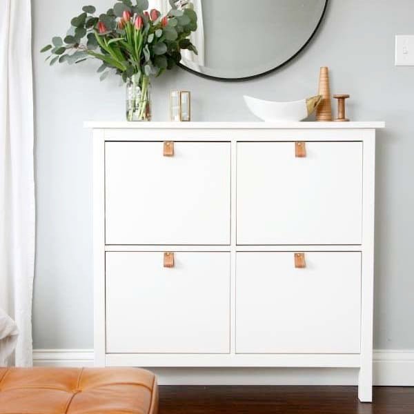 It has two hinged doors. The doors have a horizontal slatted design with spaces between the slats.
