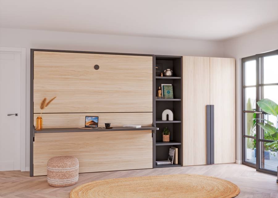 Discover a smart solution for small rooms. Our horizontal folding bunk bed with integrated desk is ideal for maximising space