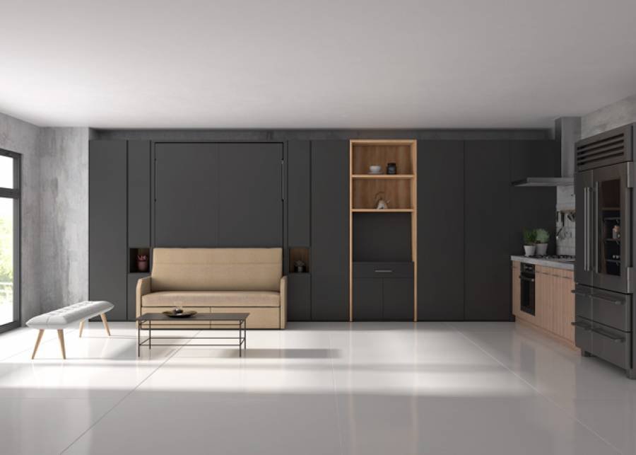 Folding double bed with sofa, wardrobes and extendable table