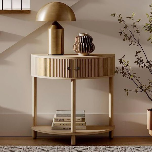 Style: Half-moon. This is a unique console table design that creates a curved silhouette against the wall. Some people also call this a demi-lune table.
