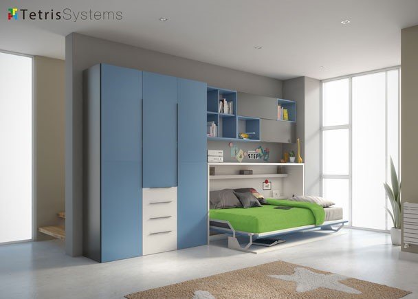 Youth bedroom with folding bed with table and Premium shelves. This composition is composed of: – folding bunk bed with table for 90×190 mattress – 2 hanging elements with lift-up door – 2 hanging elements with one space – 2 hanging elements with double space – wardrobe with 3 doors of 132x45x240 with drawers and shelves