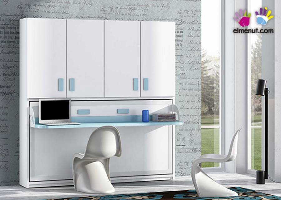 Horizontal folding bed for a 90 x 190 mattress with desk. The module has a large wardrobe with 4 swing doors and two compartments at the top; one with a hanging rail and the other with shelves.