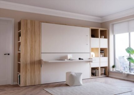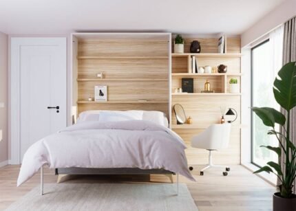 Horizontal folding bed with desk from the UD series, with corner wardrobe and stacked bookcase