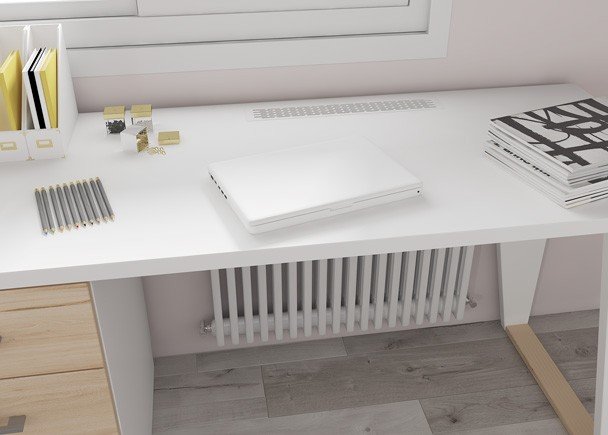 To the left of the fold-down bed there is a bookcase as a terminal, and to the right a complete office has been built that can accommodate two people. In this case, drawers have been chosen for the lower units and hanging shelves, but the combinations are endless.