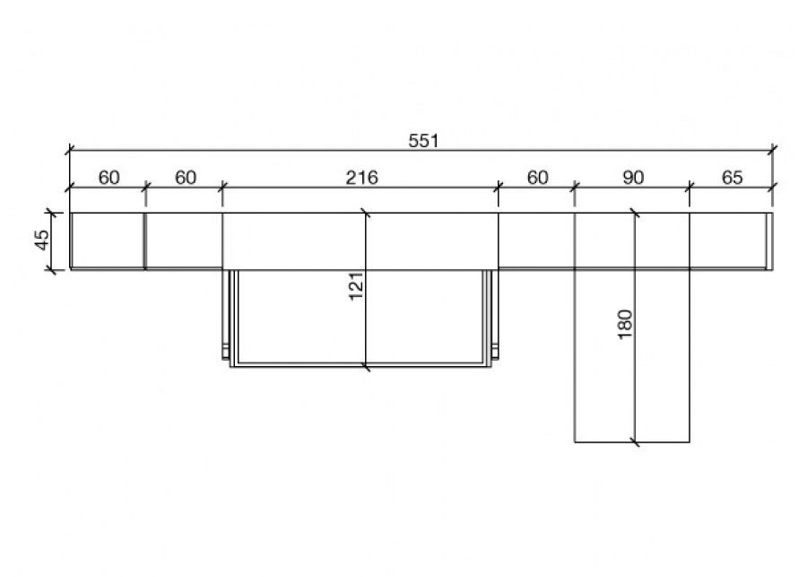 The rest of the composition is defined as a storage area with hanging cupboards and floor-standing containers, which are finished off with a work area with a T-shaped peninsula table, resting on the lower modules. On the other side, it is closed off with a tall cupboard aligned with the folding one.