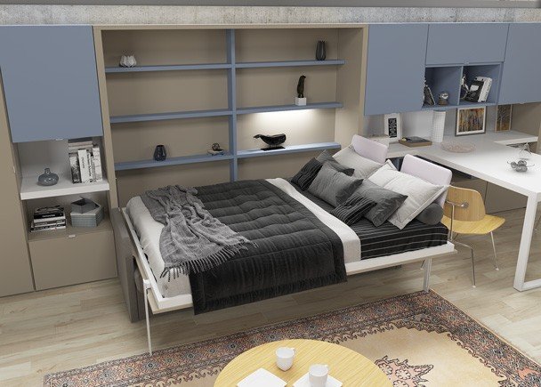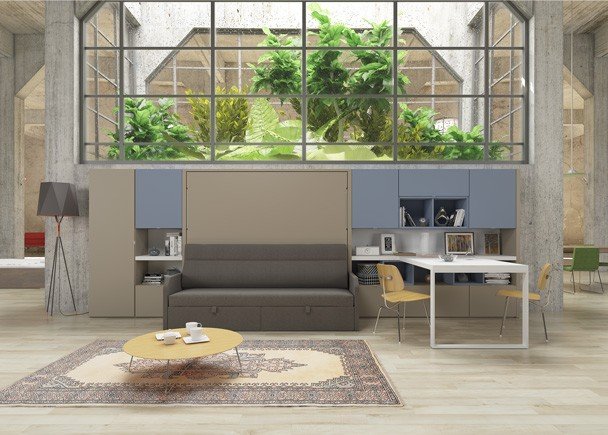 This environment is built around the horizontal folding bed with sofa , belonging to the DIVERSO series by Tetris Systems.