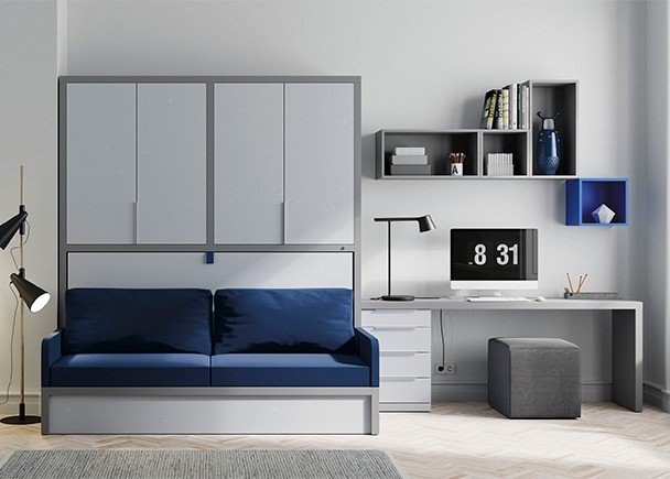 Youth room with a horizontal folding bed and sofa, for a mattress measuring 90 x 190. The furniture comes with a wardrobe with 4 swing doors on the top. In addition, the room is completed with a study area with a lower drawer unit and an asymmetrical wall composition.