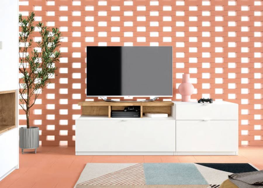 A TV area with an asymmetrical low module has been planned on the perpendicular wall.