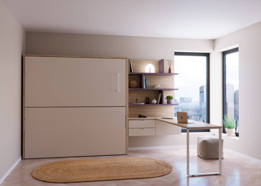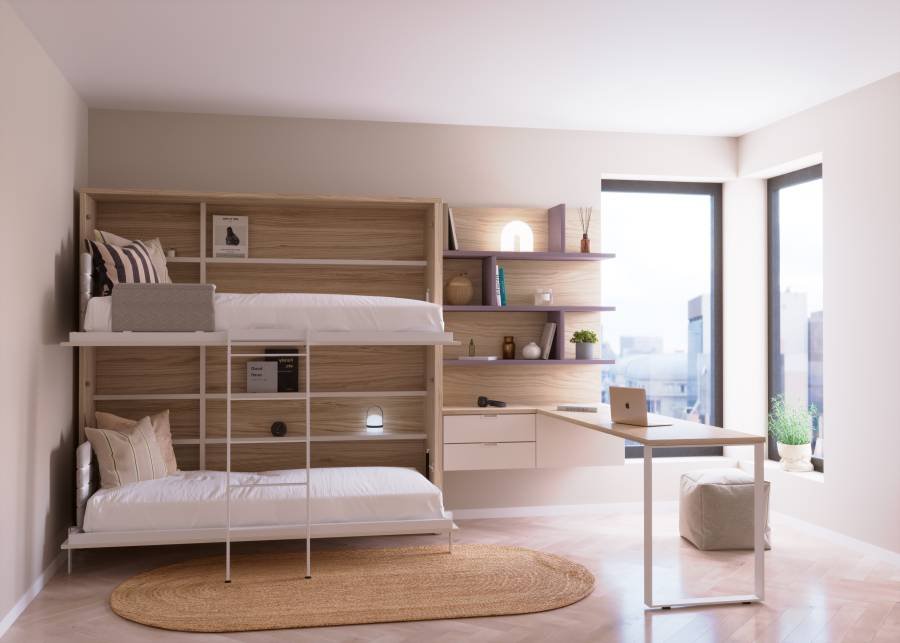 A versatile space that combines comfort and creativity: discover a unique bedroom with a horizontal folding bunk bed and study area.