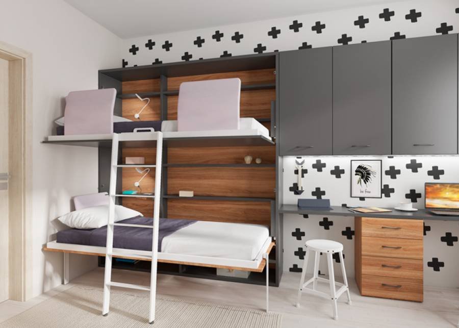 Horizontal folding bunk bed with study area and hanging wardrobes