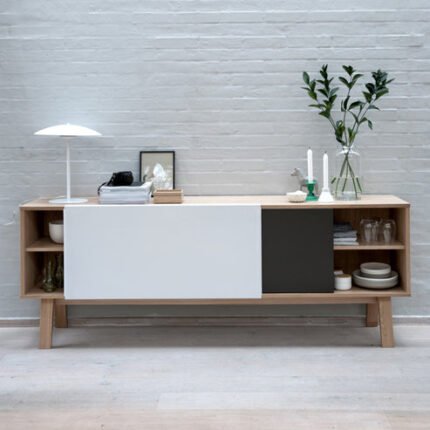 The sideboard table is made of wood with a light finish and a natural wood grain. It has a rectangular shape with clean lines and a modern design. Here?s a more detailed description of the sideboard table: