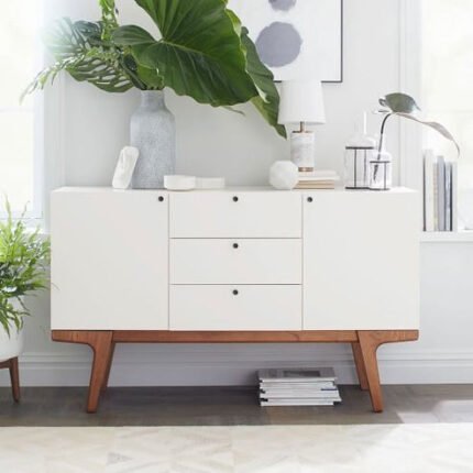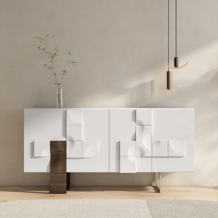 Doors: The four doors have a simple, flat design with rectangular knobs in a chrome finish. The doors are inset slightly from the frame of the sideboard table.