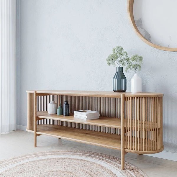This is a simple, floating shelf. It?s made of wood and stained a Light color.