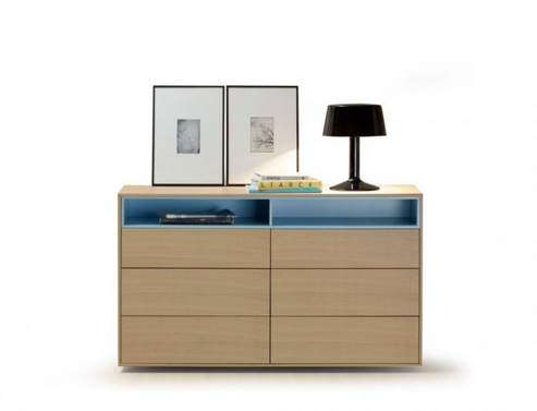 The drawer is part of a wooden chest of drawers. It has a dark stain and a smooth finish.