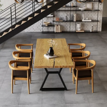 The black steel frame not only adds a nice contrast to the wood, but it also functions as a footrest.